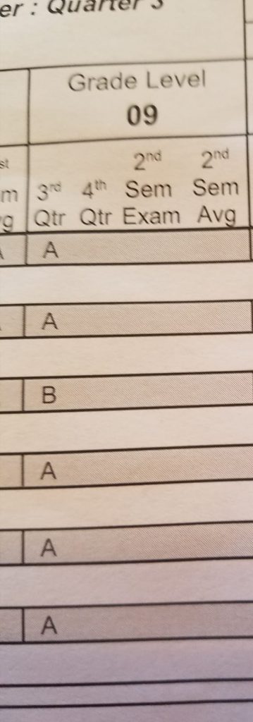 And the result is that she is a high school student in a large public school, without any assistance, making good grades. Her teachers describe her “ability to function” as dedicated, well behaved, driven, sincere, a pleasure in the classroom, actively engaged, and one of their best students. She has picked her college as a freshman and is taking advanced classes to try to get over the 4.0 GPA level going into next year.