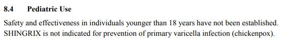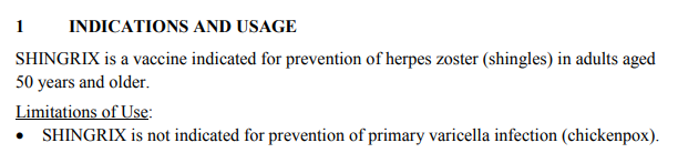 The more recent vaccine, Shingrix, is a live-virus vaccine. [Edit: A reader has pointed out that I got the shingles vaccines backwards: Zostavax, the older vaccine, is the live-virus one. Shingrix is a “non-live recombinant, AS01B adjuvanted” vaccine. (Don’t get me started on adjuvants; that’s a blog for another day.) This just goes to prove my frequent refrain: No one gets it all right. Don’t take anyone’s word for it, not even mine. Read the sources!] As the insert states it is “indicated for prevention of herpes zoster (shingles) in adults aged 50 years and older.”