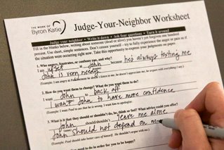 Ms. Katie had us all fill out a “Judge Your Neighbor Worksheet” on which there were four questions designed to help us gain insight into a situation where you and another person are in conflict. These questions and Ms. Katie’s method of taking them and “turning them around” is more commonly known as “The Work.”
