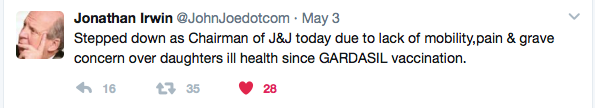 So it was with a heavy heart that Jonathan Irwin stepped down as CEO last week in a shocking announcement via Twitter. His reason? To care for his daughter who is bedridden, following what he says was a severe reaction to the Gardasil vaccine. The usual vitriolic attacks from the motley crew of pro-HPV-vaccine-at-all-costs media reps, professors, doctors, and “concerned individuals,” which normally descends on such posts, was noticeably absent. It seemed like there was a kind of stunned silence that such a prominent figure as Mr. Irwin would make such a claim.