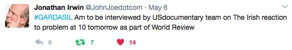 I have been writing about this topic for two years, trying to understand how this has been allowed to go on for so long without redress from the current Minister for Health and his predecessor, Leo Varadkar. We are so very sorry for Mr. Irwin’s daughter’s ill health, as his family has suffered so many tragedies throughout the years, but we will be forever grateful for his and his wife’s support in shining a light on the plight of the Gardasil Girls in Ireland.