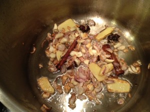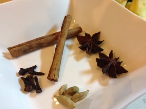 Whole spices - 1 large cinnamon stick, 2 star anise, 5 cloves, 3 cardamoms