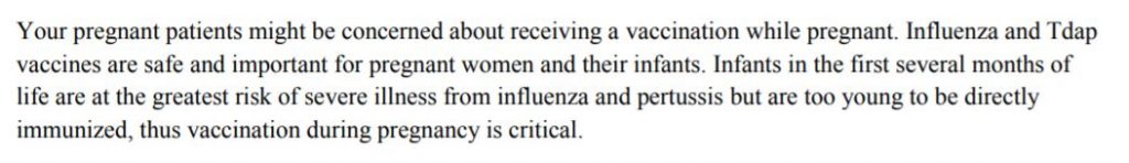 The first two pieces of paper are a two-page letter that your doctor received telling him to vaccinate you. It is from the CDC and the Department of Health and Human Services and it is signed by 14 other health authorities. It says things like, “Influenza and Tdap vaccines are safe and important for pregnant women and their infants,” and “Studies confirm that your recommendation and offer of vaccines are essential.”
