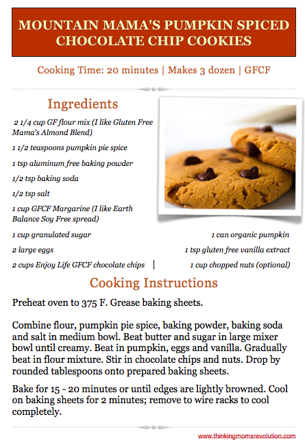 Mountain Mama shares her pumpkin spiced chocolate chip cookies recipe. Scrumptious and more-ish. A GFCF Halloween treat!
