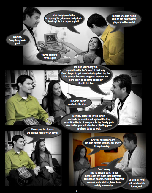 Monica and Jorge, a pregnant Hispanic woman and her husband go to a prenatal visit with their obstetrician, who recommends flu shots for the whole family. Monica is reluctant. She’s never needed a flu shot before, including her previous pregnancy, and she is understandably hesitant to add drugs to her system that are not required at this sensitive time in her baby’s development.