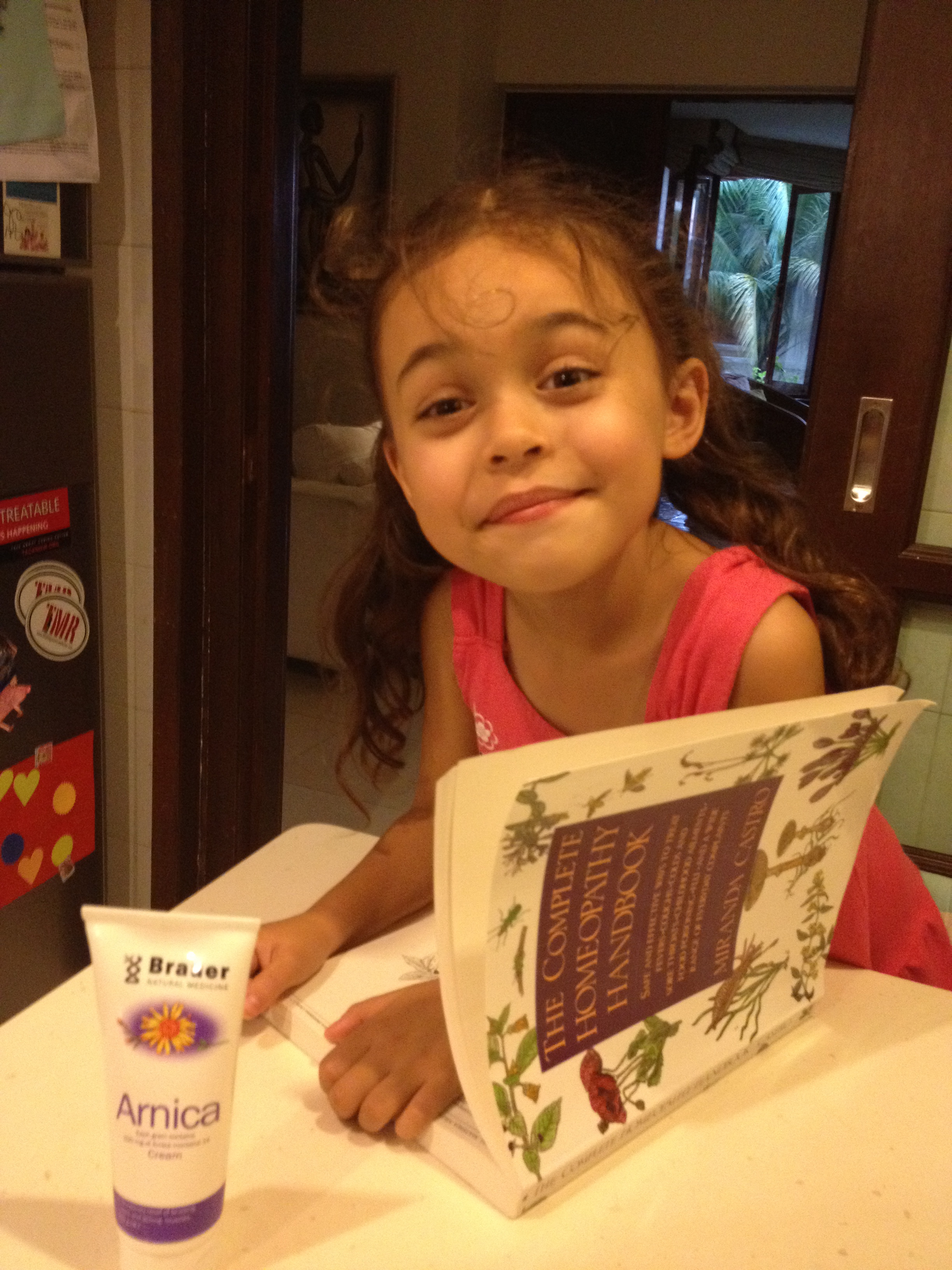 Unsatisfied with the answer, she looks it up in the Miranda Castro book The Complete Homeopathy Handbook: Safe and Effective Ways to Treat Fevers, Coughs, Colds and Sore Throats, and Childhood Ailments.